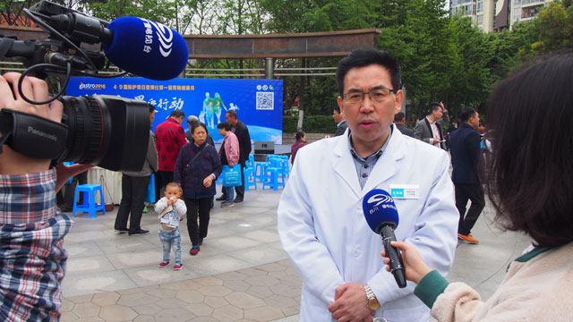 (图:王主任在国际护胃日公益活动中接受四川电视台采访)